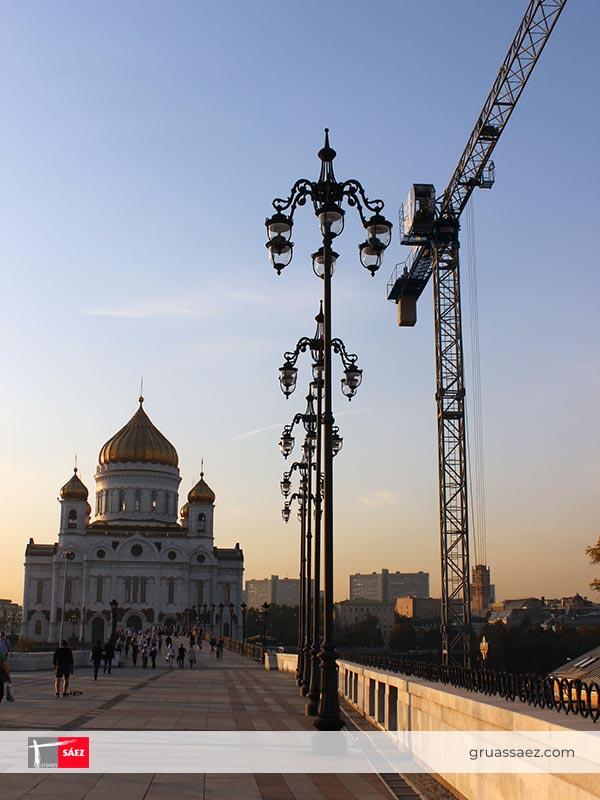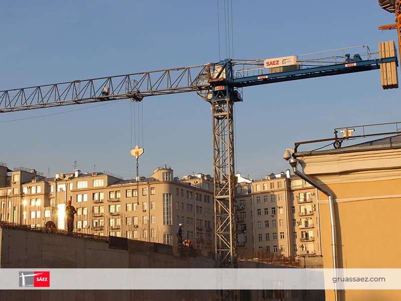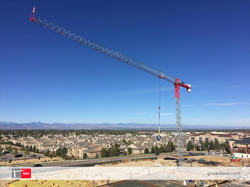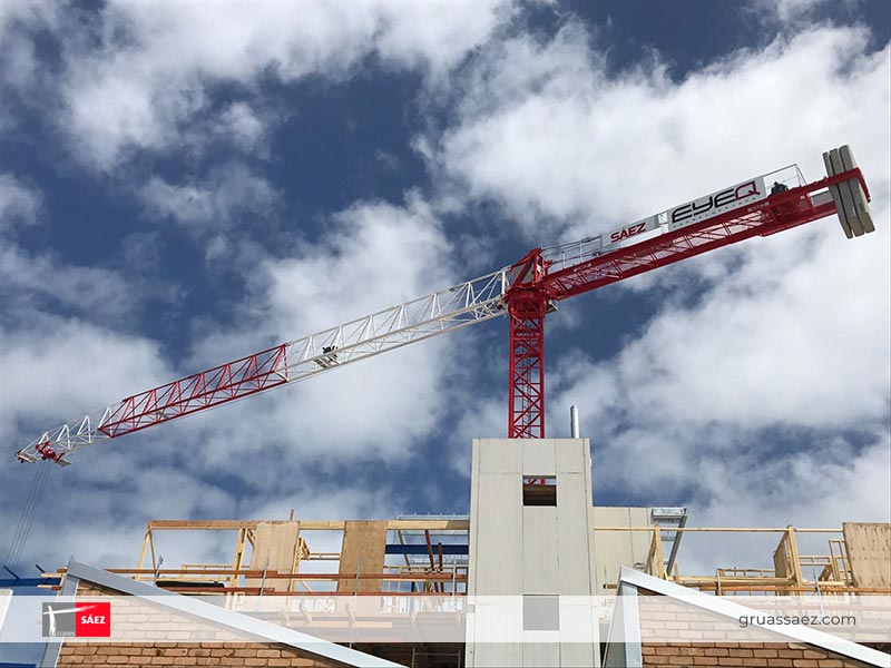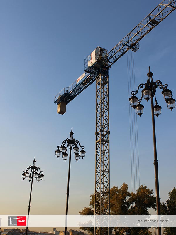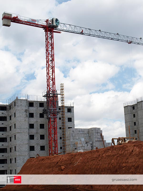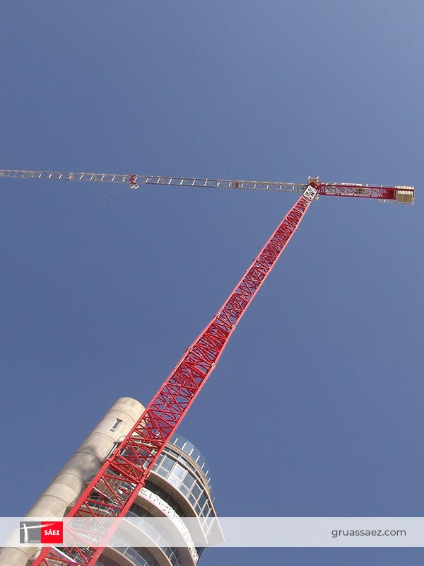 Aus 55m Entfernung. Auch dieser Kran wird oft mit einer Fahrerkabine oben auf dem Turm Kopf montiert, um eine bessere Sicht und eine bessere Kontrolle über die Positionierung der Elemente während des Be- und Entladens und der Bewegung zu haben.